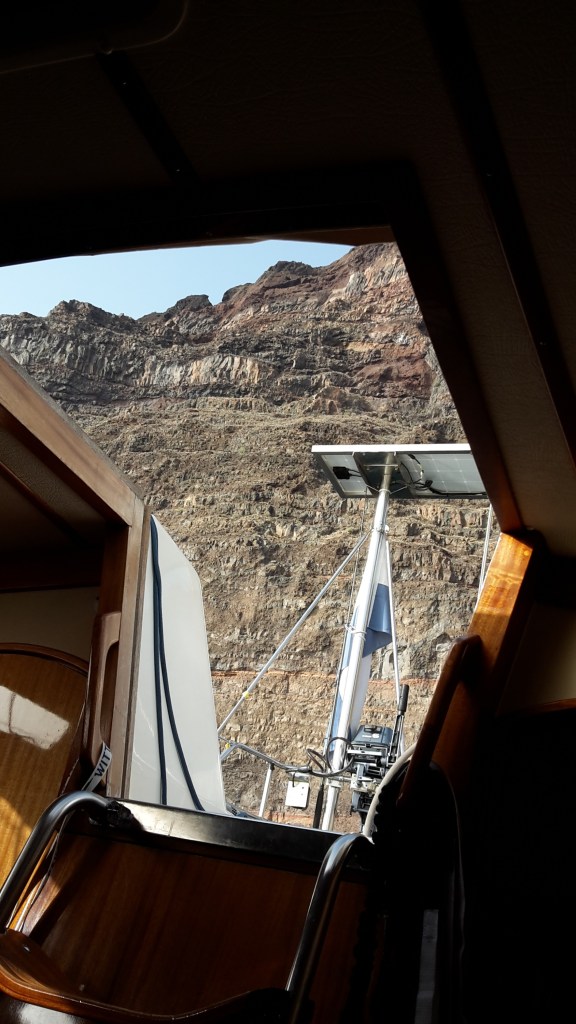 Around 16:30 we finally threw our anchor at Valle Gran Rey, an impressive compilation of rocks, on the south east side of La Gomera. We spent the night there only to be woken by massive gusts and swell very early in the morning. It was scary but thrilling experience taking the anchor up, being able to saw the gust coming due to the ripple effect on the sea surface and our perfect coordination with Jelle; him managing the anchor winch and me behind the steering wheel. It took us much longer than usual, having to stop every few minutes to let the gust pass, but around 8 in the morning we managed to leave the imposing anchorage and head to La Palma.