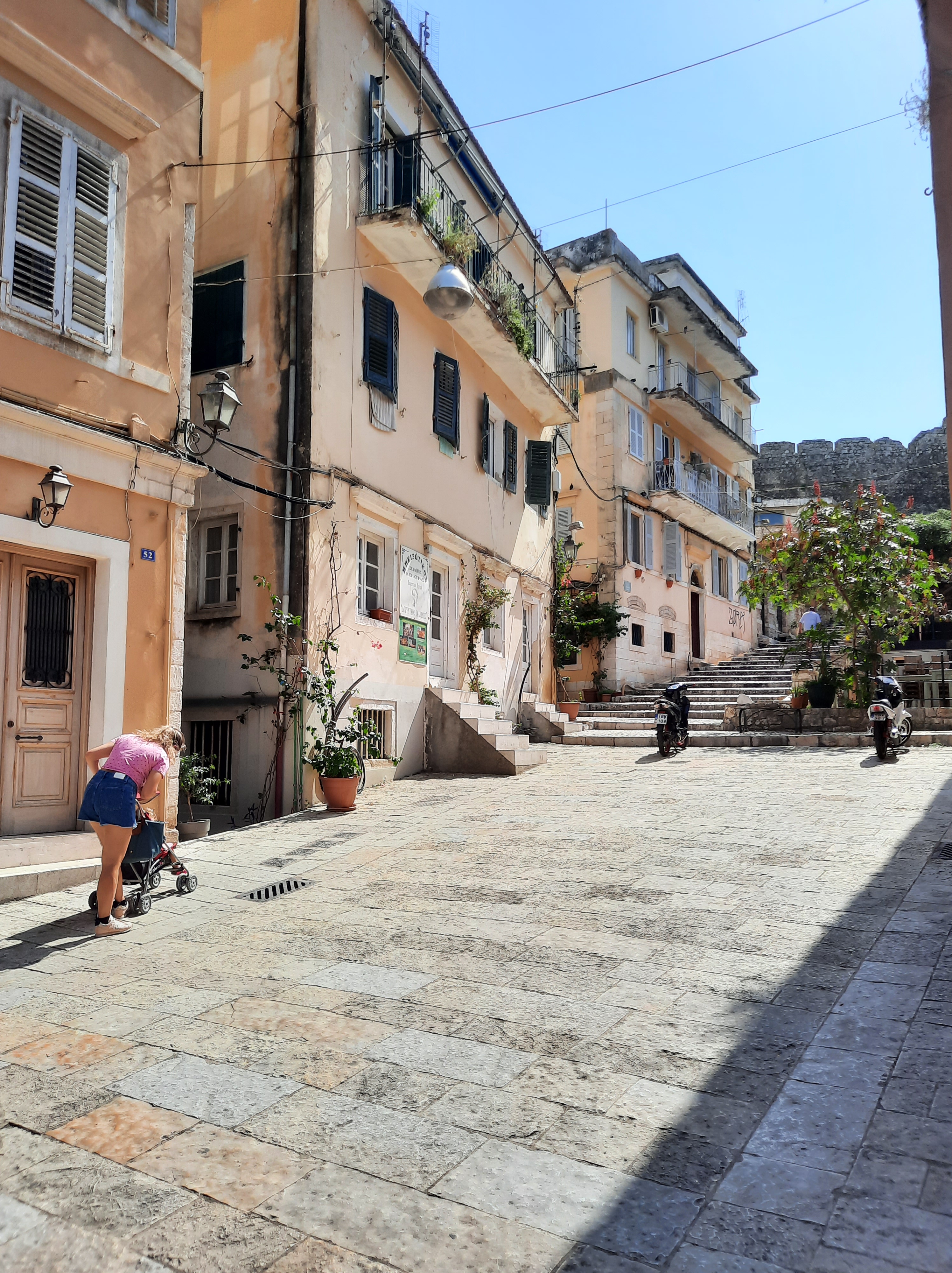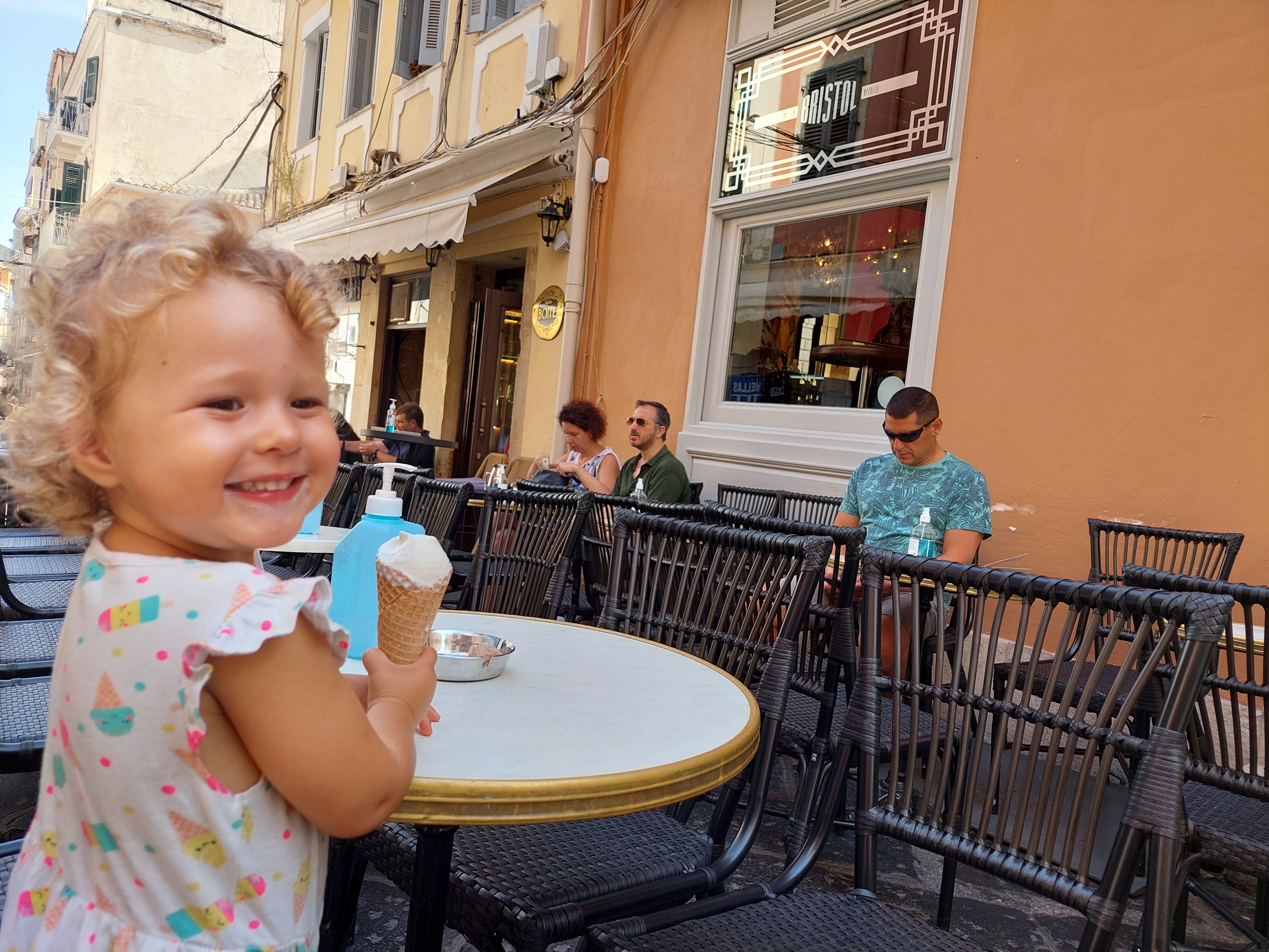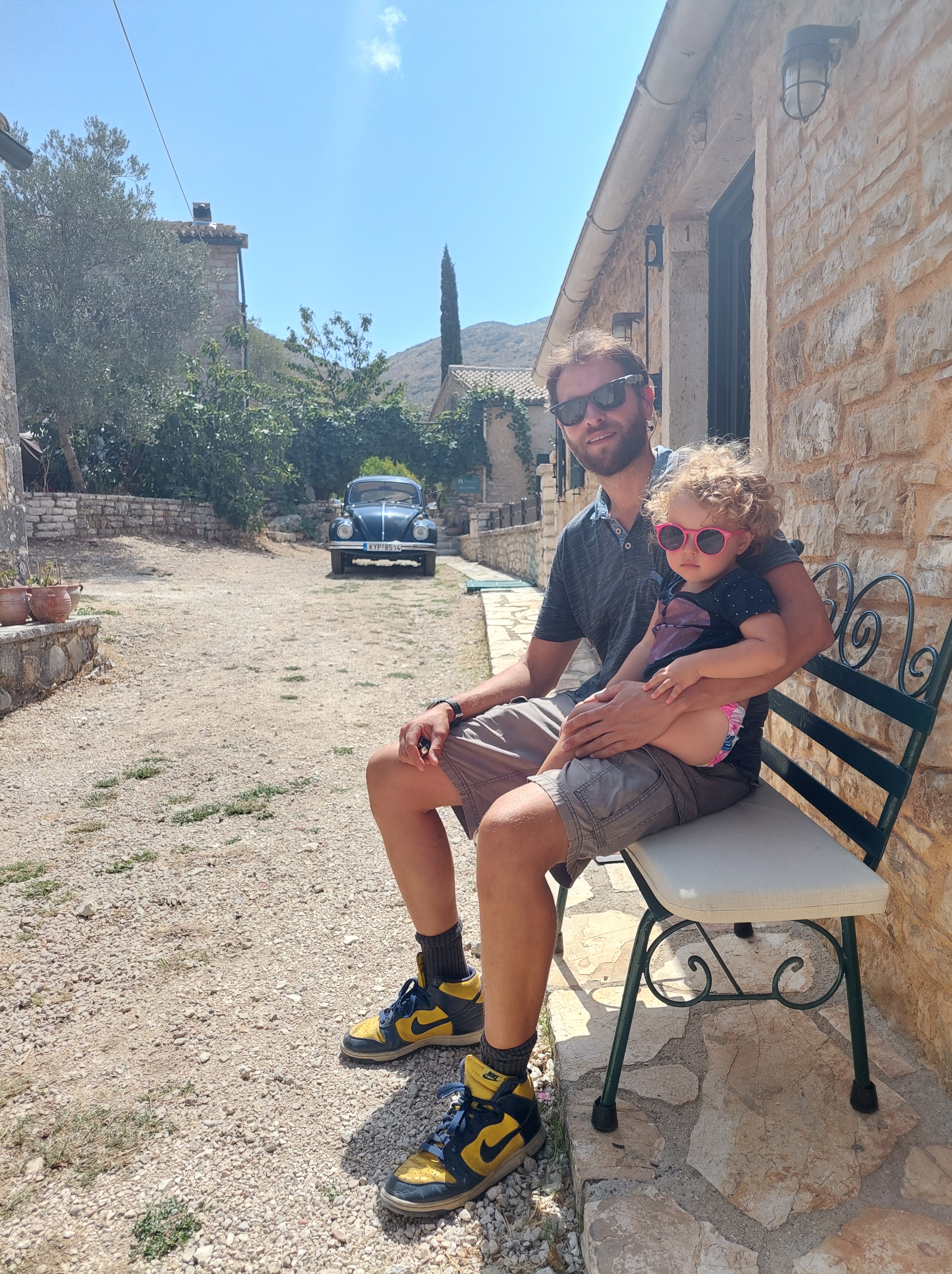 We also rented a car for a day and visited the oldest village in Corfu, Palea Perithea, an abandoned place with ancient ruins and two taverns for the tourists. We visited Palaiokastritsa, a once beautiful, wild bay but now a very busy, touristic resort full of hotels, rental boats, and too many people. Our last stop was Pontikonisi, a tiny little islet where only a boat takes you and where you could also witness many airplanes landing and taking off on the airstrip right next to the land. That stop was Jelle’s and Elena’s favorite and we spent a long time checking out airplanes!