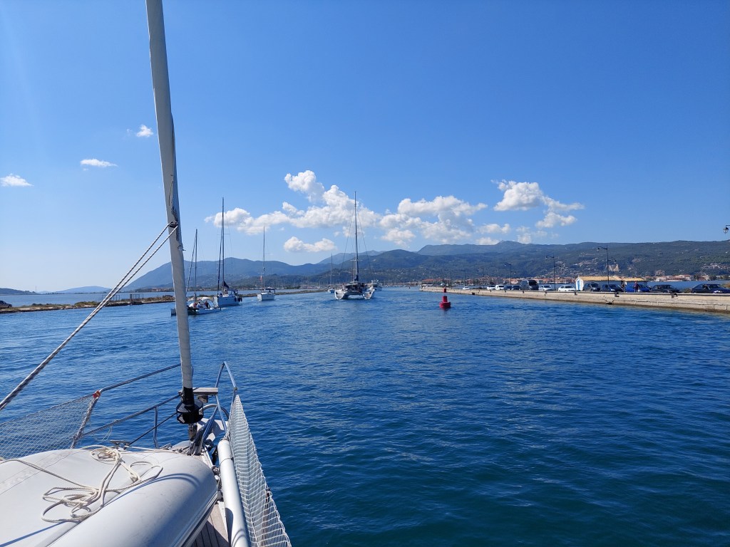 After 5 days in Preveza and with our batteries full (figuratively and literally), we set sail to the next island; Meganisi. Lefkada is right across Preveza and the obvious choice, but we wanted something less touristic and wilder than that. Still, we had to cross Lefkada’s floating bridge to get to the other side, a very interesting route; Boats of all sizes and shapes were crossing from both sides, all maintaining similar speed in the channel since the sides of the channel were swallow salt lakes on the one side and a massive marina on the other side.